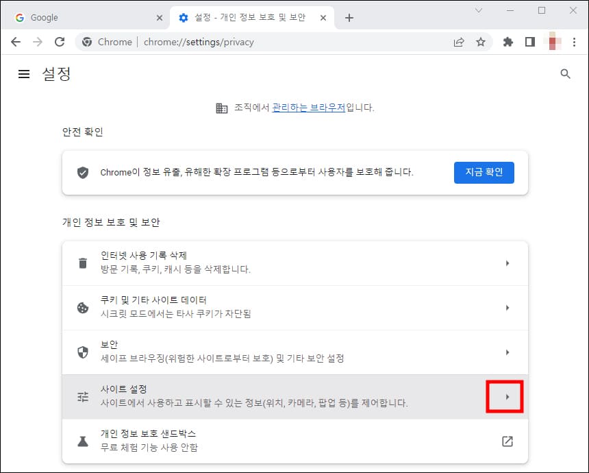 개인 정보 보호 및 보안에서는 인터넷 사용 기록, 쿠키, 보안, 사이트 설정, 개인정보 보호 샌드박스 기능을 제공하고 있습니다. 이 중에서 사이트 설정을 선택합니다.