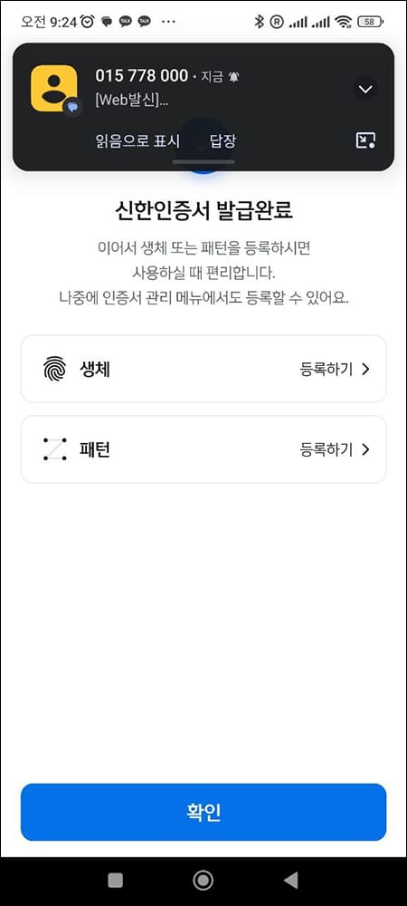 신한인증서 발급이 완료되면 등록되어 있는 전화번호로 문자가 발송됩니다. 이제 생체 또는 패턴을 등록해 사용할 수 있습니다. 바로 등록해도 되고 나중에 신한인증서 관리 메뉴에서도 등록할 수 있습니다.
