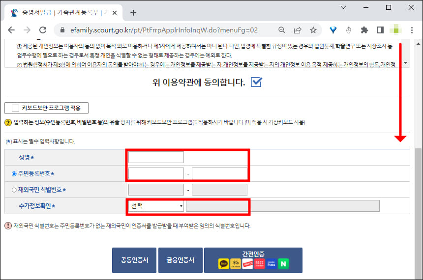정보를 입력한 후 공동인증서, 금융인증서, 간편인증 중 한 가지를 선택합니다.