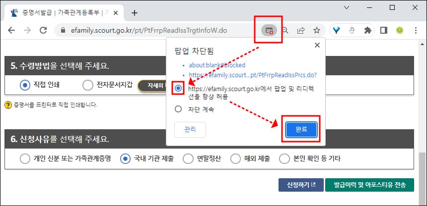 만약 브라우저에 팝업 차단이 되어 있다면 주소창 옆에 팝업 차단 아이콘이 나옵니다. 아이콘을 클릭하면 팝업 차단됨 내용과 허용 옵션이 나옵니다. 인터넷 발급을 받으려면 항상 허용을 선택한 후 완료 버튼을 누릅니다.