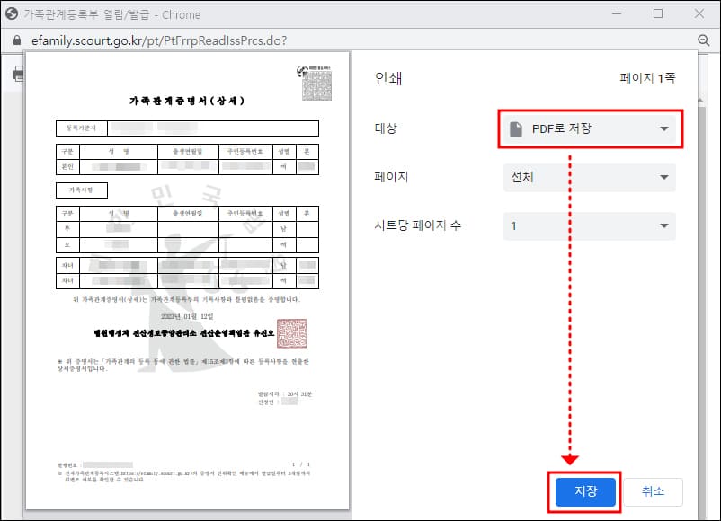 가족관계증명서 인터넷 발급할 때 인쇄 대상을 프린터로 설정하면 바로 출력할 수 있고, 파일 형식으로 제출할 용도라면 PDF로 저장하면 됩니다. 집에 프린터가 없다면 PDF로 저장 후 나중에 출력하는 것도 하나의 방법입니다.