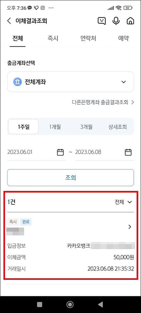 상단메뉴에서 이체결과 조회를 선택합니다.