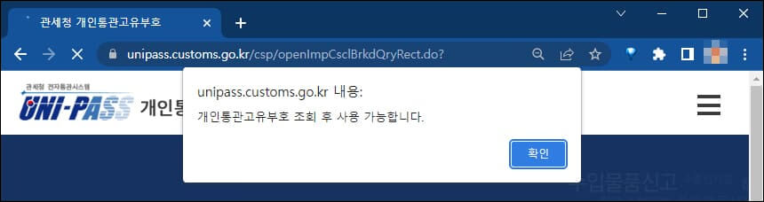 모든 과정을 제대로 따랐다면 개인통관고유부로 발급이 정상적으로 완료되었다는 알림창이 뜹니다.