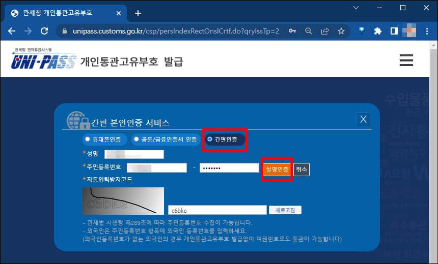 "개인통관고유부호발급"은 간단한 본인인증 후 이용 가능 합니다.