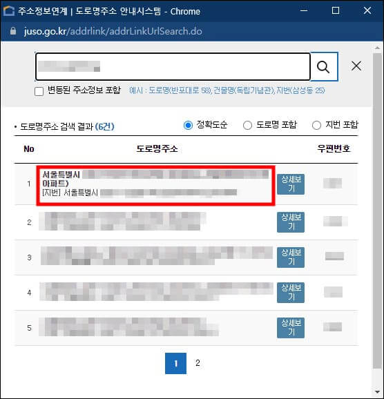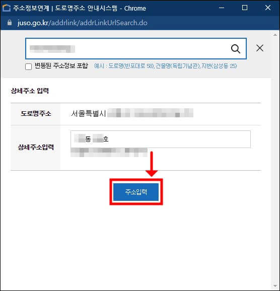 도로명 주소 안내시스템 새창이 뜨면 주소를 적고 검색 결과를 선택한 후 상세주소까지 정확하게 입력합니다. 주소지는 주민등록증에 적혀 있는 주소와 동일하게 작성하면 됩니다.