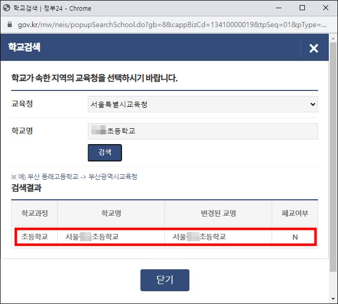학교 검색에서는 학교가 속한 교육청을 선택하고 학교명을 입력한 후 검색을 하면 됩니다. 검색 결과에 나온 학교를 선택하면 자동으로 창이 닫힙니다.