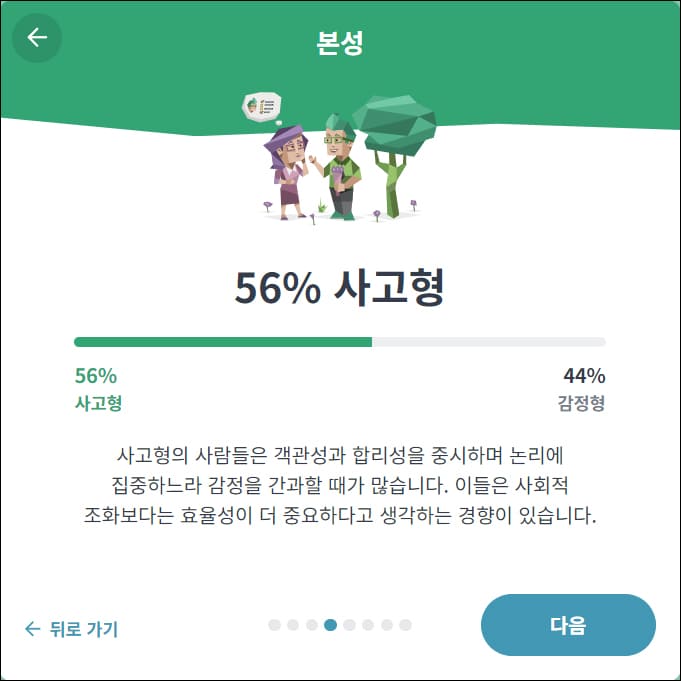 이에 비해 정신과 본성은 51%, 56%로 직관적이고 사고적이라고 말하기는 조금 애매합니다.