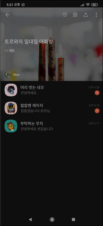 위의 대화방을 눌러서 아래와 같이 일대일로 대화가 가능합니다. 익명으로 대화방 입장이 가능하니, 상대방이 카카오프랜즈 아이디로 익명으로 입장이 가능 합니다.