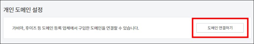 중간에 있는 개인 도메인 설정을 선택합니다. 도메인 등록 업체에서 구입한 도메인을 연결할 수 있다는 안내가 있고 오른쪽에 '도메인 연결하기' 버튼이 있습니다.