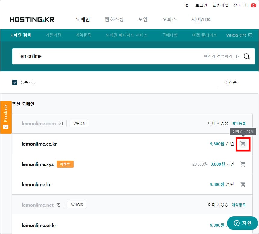 도메인 주소를 입력하면 하단에 추천 도메인 리스트가 나옵니다. 인기가 많은 '.com' 주소는 이미 사용 중이어서 '.co.kr'을 선택해 장바구니에 담았습니다. 가끔 이벤트로 저렴한 금액의 도메인들이 나오긴 하는데 개인적으로 신뢰가 가지 않는 주소들보다 도메인 지수가 높은 주소를 찾는 게 낫지 않을까 생각합니다.